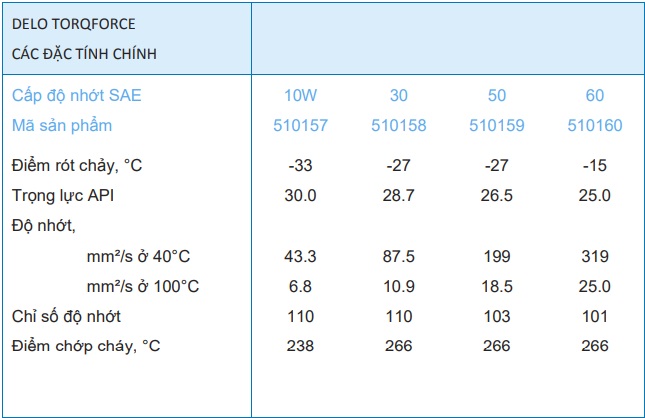 Caltex Delo TorqForce 30 50 60 10W được pha chế từ dầu gốc khoáng tinh chế kết hợp hệ phụ gia tẩy rửa và phân tán, ức chế oxy hóa và ăn mòn, chịu cực áp và chống tạo bọt phù hợp cho cả hệ truyền động đời mới và đời cũ, kể cả trong điều kiện tải nặng và làm việc khắc nghiệt.
