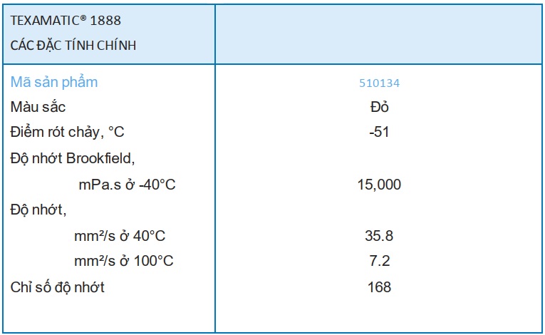 Caltex Texamatic 1888 là dầu hộp số tự động (ATF) hiệu năng cao, đa dụng, có khả năng chống mài mòn và bền với ứng lực cắt. Sản phẩm đã được chấp thuận bởi: Allison Transmission và Voith Turbo.