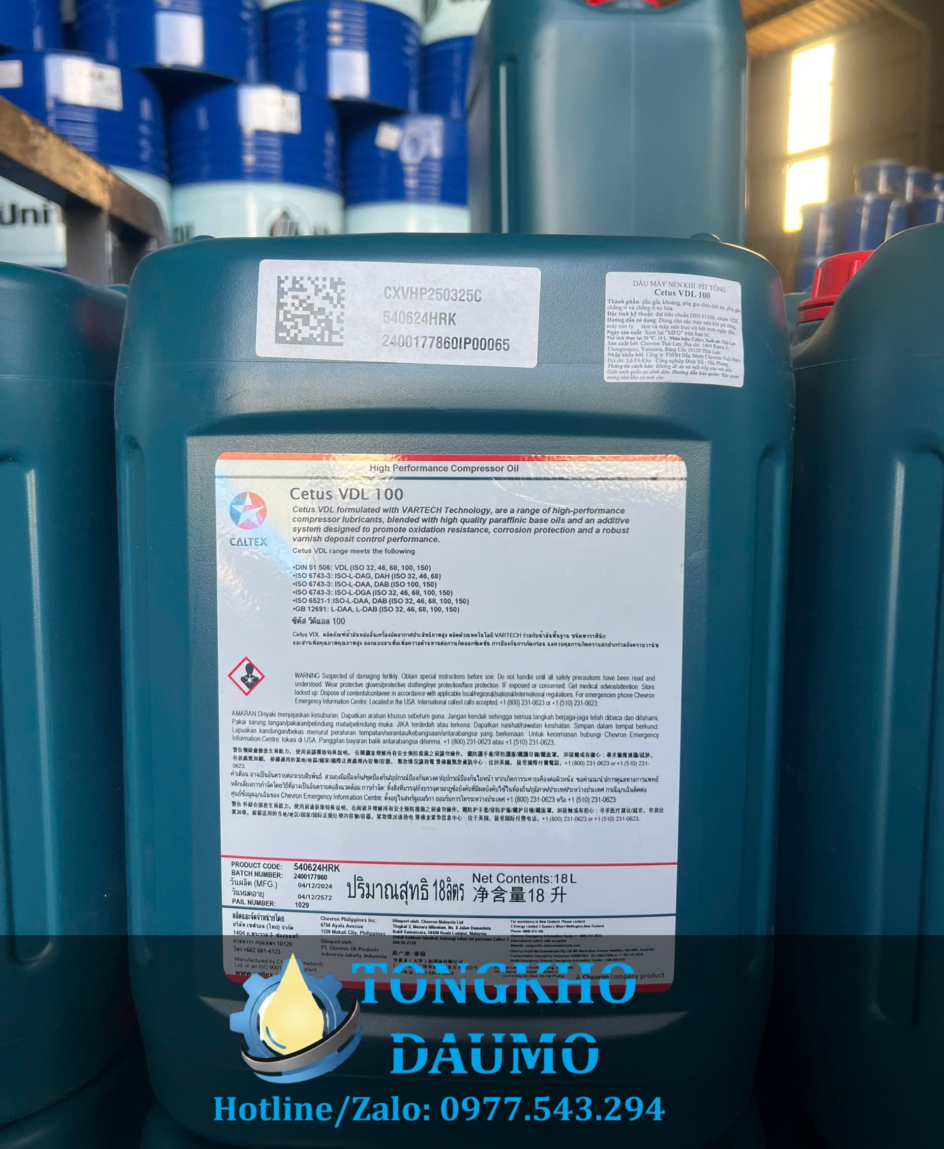 Caltex Cetus VDL là dầu bôi trơn máy nén khí hiệu năng cao, được pha chế với Công nghệ VARTECH, kết hợp dầu gốc parafin chất lượng cao cùng hệ phụ gia đặc biệt nhằm tăng khả năng chống oxy hóa, chống ăn mòn, kiểm soát và giảm hình thành cặn vecni.