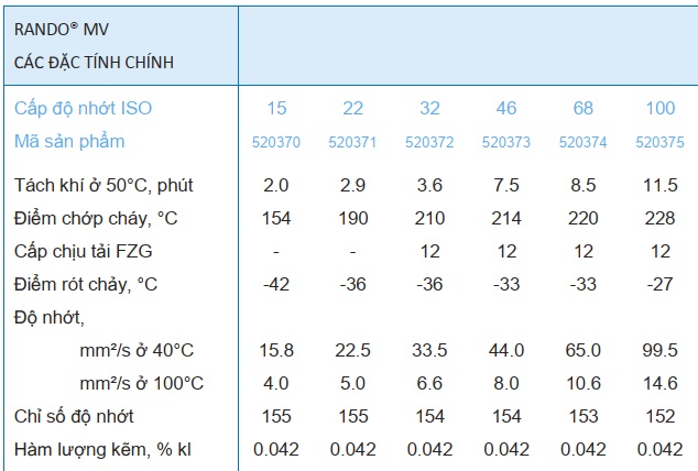 Lưu ý: Với các ứng dụng yêu cầu phê duyệt chính thức từ Parker Hannifin (Denison), Eaton-Vickers hoặc MAG Cincinnati Machine, nên sử dụng Rando® HDZ.