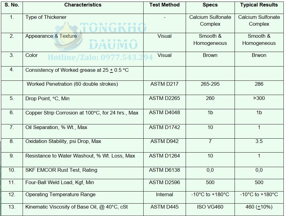Thông số kỹ thuật của mỡ Grenvo Calcium Sulfonate Complex 2